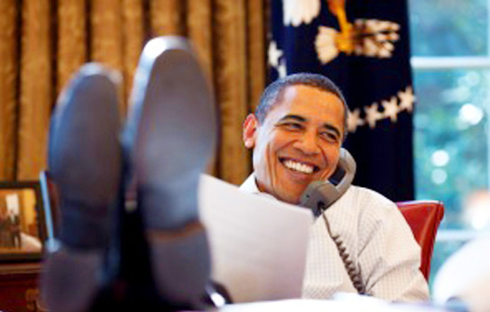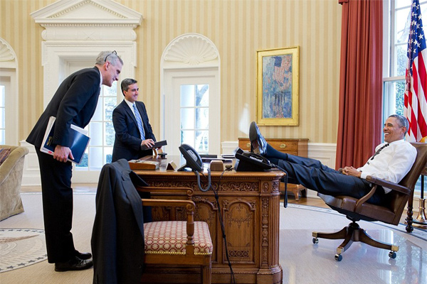 Previously, the President has been clicked with his feet strut up on his desk on several occasions.